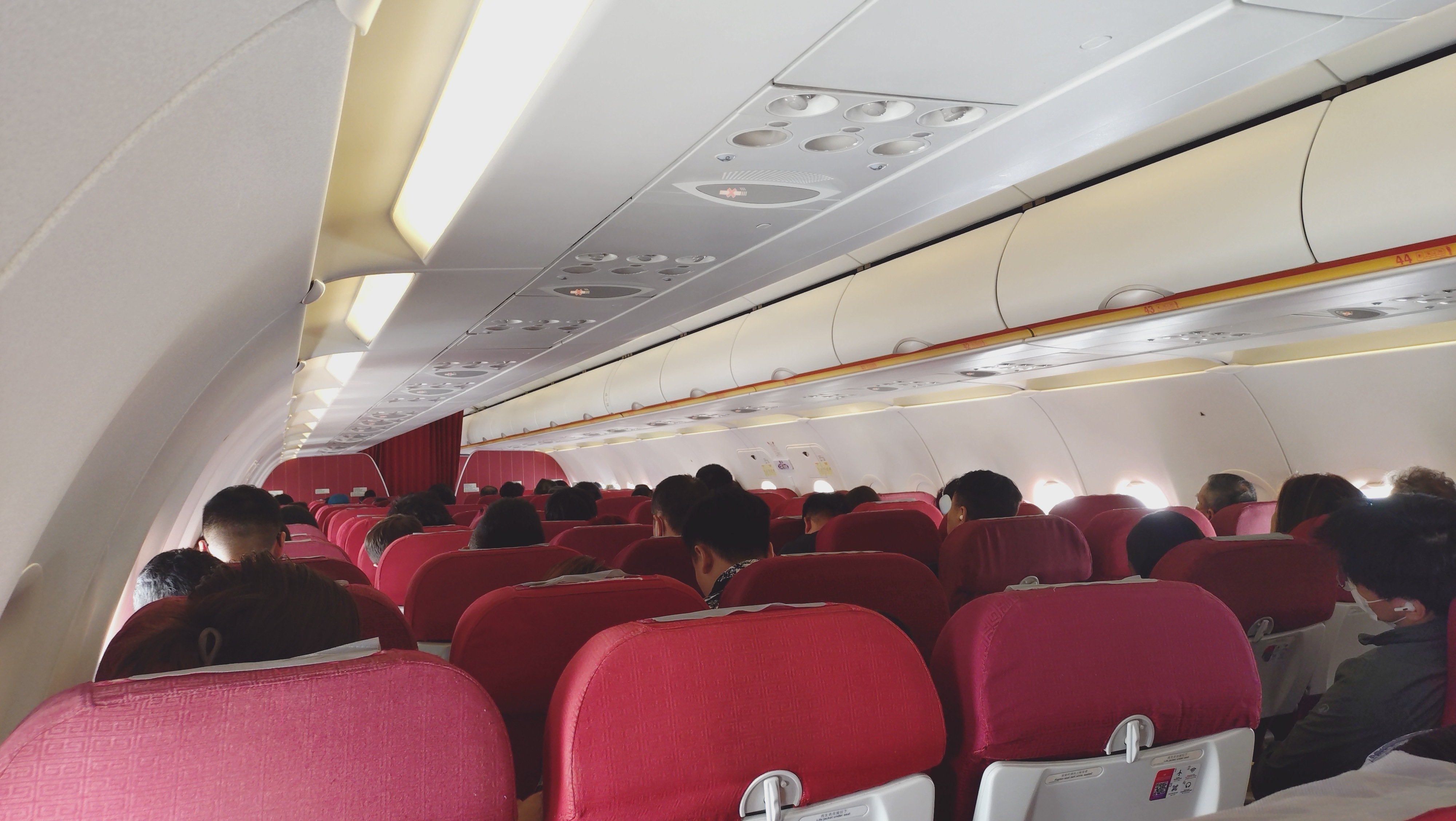 搭乗開始は定刻通りの13時15分。先発の香港エクスプレスUO251が1時間延発していたのでこちらはどうか、と思いましたが、30分遅れに留まる14時15分に離陸しました。