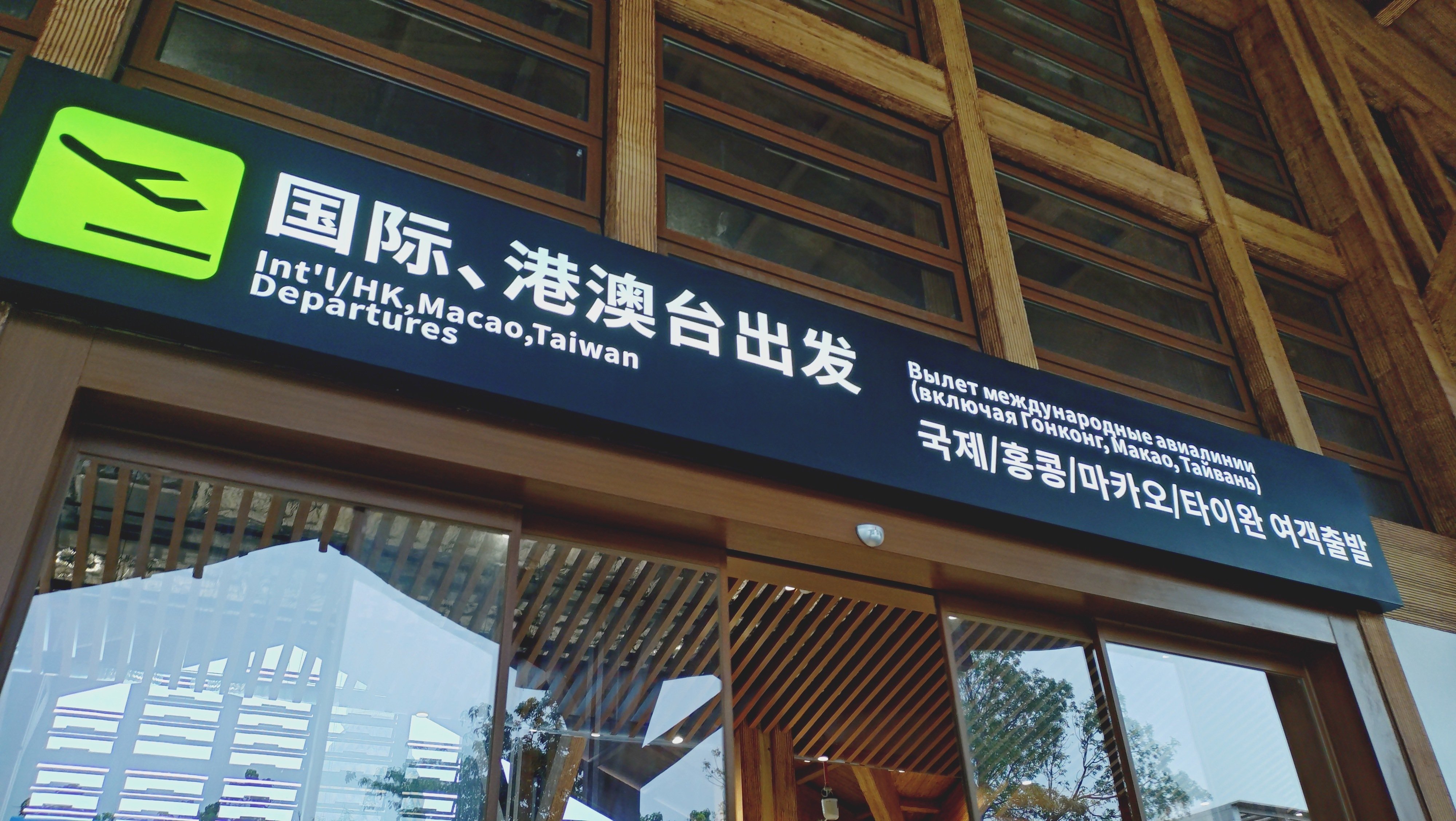 江沢民の手になる看板もある国内線ターミナルとは裏腹に、国際線ターミナルは建設中のようで、仮設(?)の建物は隅に追いやられています。