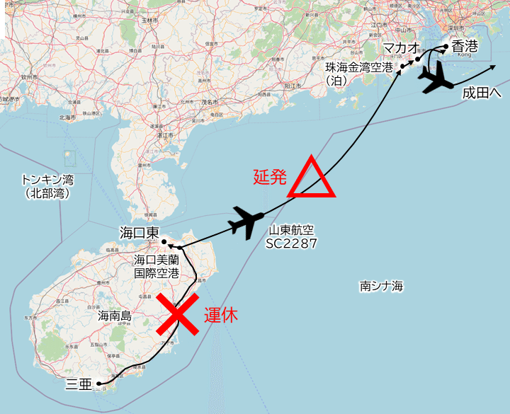 本来の予定は、5日朝に高速鉄道で海口へ移動して観光。夜に山東航空SC2287便で珠海に飛んで宿泊し、翌6日にはバスでマカオ・香港を観光して深夜便(香港航空HX606)で帰国、というものでした。
